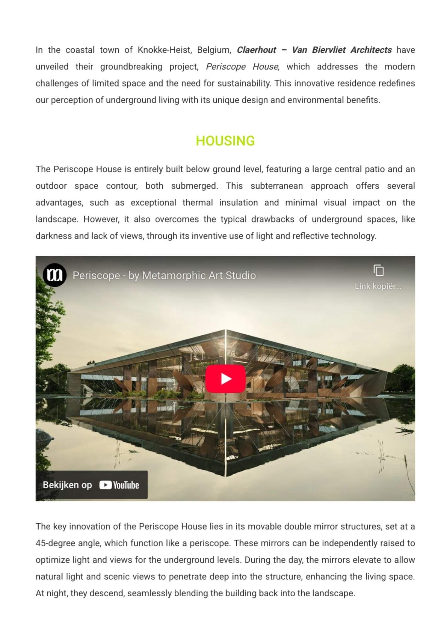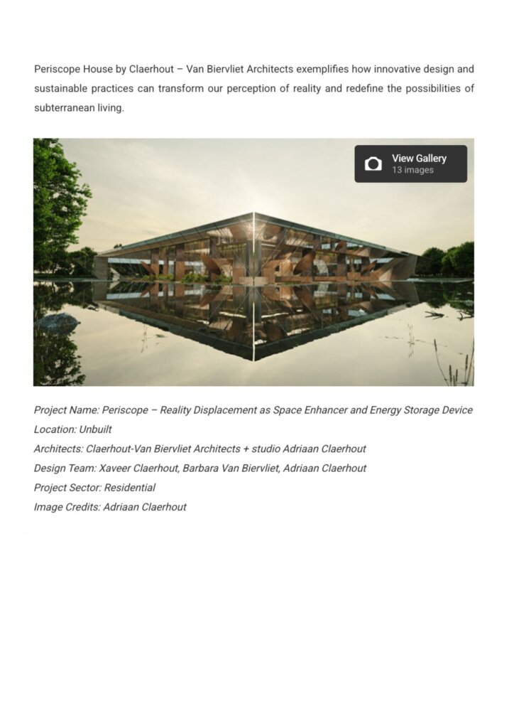 “In the coastal town of Knokke-Heist, Belgium, Claerhout – Van Biervliet Architects have unveiled their groundbreaking project, Periscope House, which addresses the modern challenges of limited space and the need for sustainability. This innovative residence redefines our perception of underground living with its unique design and environmental benefits.