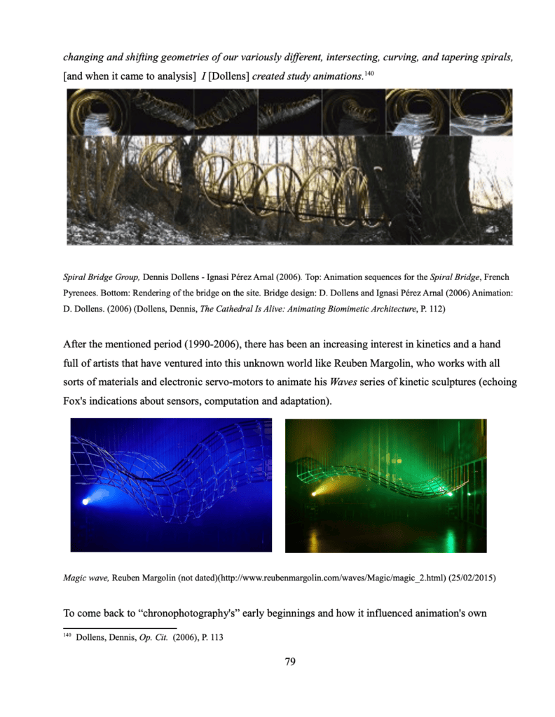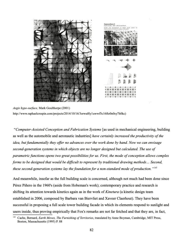 “And meanwhile, insofar as the full building scale is concerned, although not much had been done since Pérez Piñero in the 1960’s (aside from Hobeman’s work); contemporary practice and research is shifting its attention towards kinetics again as in the work of Kinetura (a kinetic design team established in 2006, composed by Barbara van Biervliet and Xaveer Claerhout). They have been successful in proposing a full scale tower building facade in which its elements respond to sunlight and users inside, thus proving empirically that Fox’s remarks are not far fetched and that they are, in fact, implementable in real world projects.