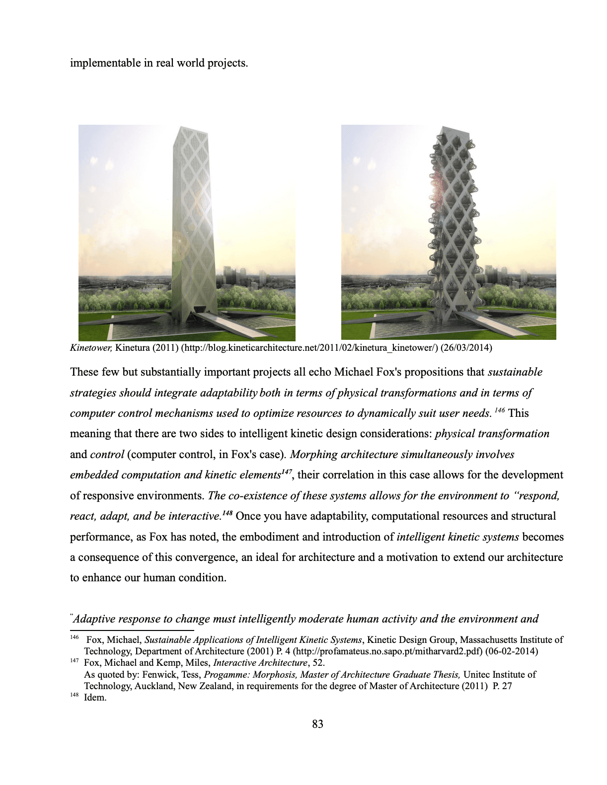 These few but substantially important projects all echo Michael Fox’s propositions that sustainable strategies should integrate adaptability both in terms of physical transformations and in terms of computer control mechanisms used to optimize resources to dynamically suit user needs. 146 This meaning that there are two sides to intelligent kinetic design considerations: physical transformation and control (computer control, in Fox’s case). Morphing architecture simultaneously involves embedded computation and kinetic elements147, their correlation in this case allows for the development of responsive environments. The co-existence of these systems allows for the environment to “respond, react, adapt, and be interactive.148 Once you have adaptability, computational resources and structural performance, as Fox has noted, the embodiment and introduction of intelligent kinetic systems becomes a consequence of this convergence, an ideal for architecture and a motivation to extend our architecture to enhance our human condition.