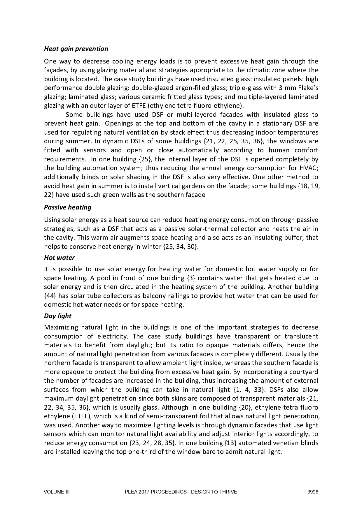 Horizontal and vertical panels or louvers as fixed or dynamic elements are designed in the cavity of DSFs as shading devices, with axial, folding or sliding movement. The materials which are used as panels in the cavity are translucent, or opaque with rectangular or curved shapes. The panels track the sun’s movement automatically and computerized Building Management systems control the movement of the kinetic facade elements to provide environmental comfort. {34, 35, 36} Balconies and terraces act as an environmental buffer that protects the building from climate extremes in both summer and winter. {4, 23, 19, 16}”